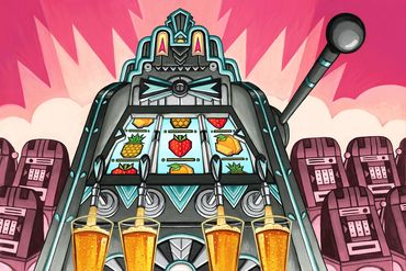 A guardian lion with a coin in his mouth, protecting a claw machine holding glowing pink spirits